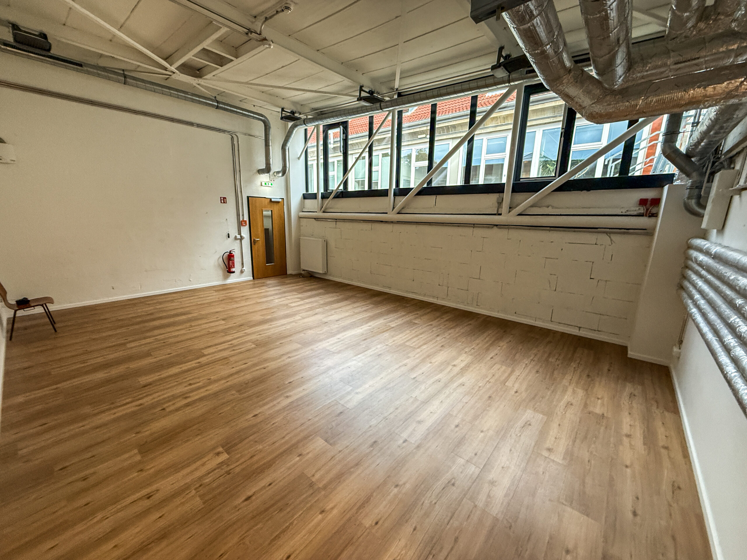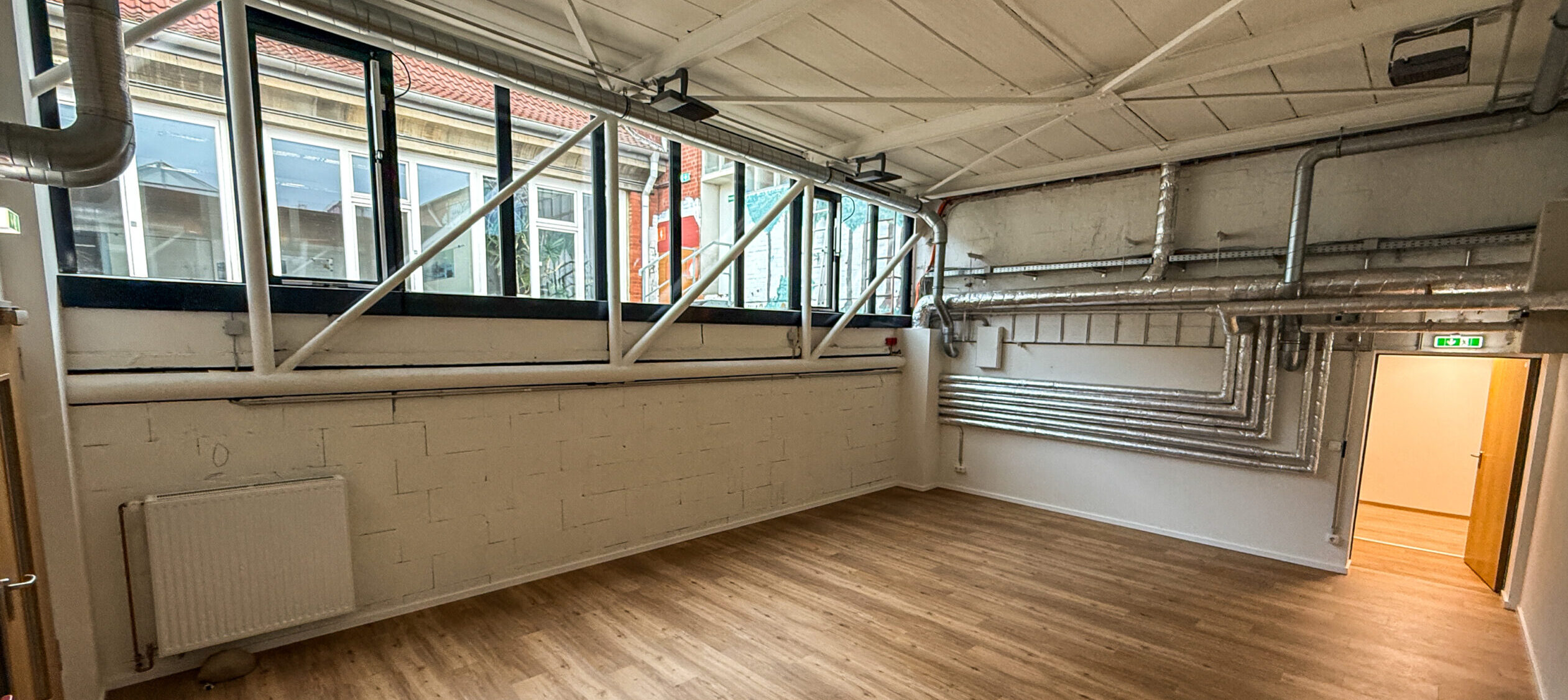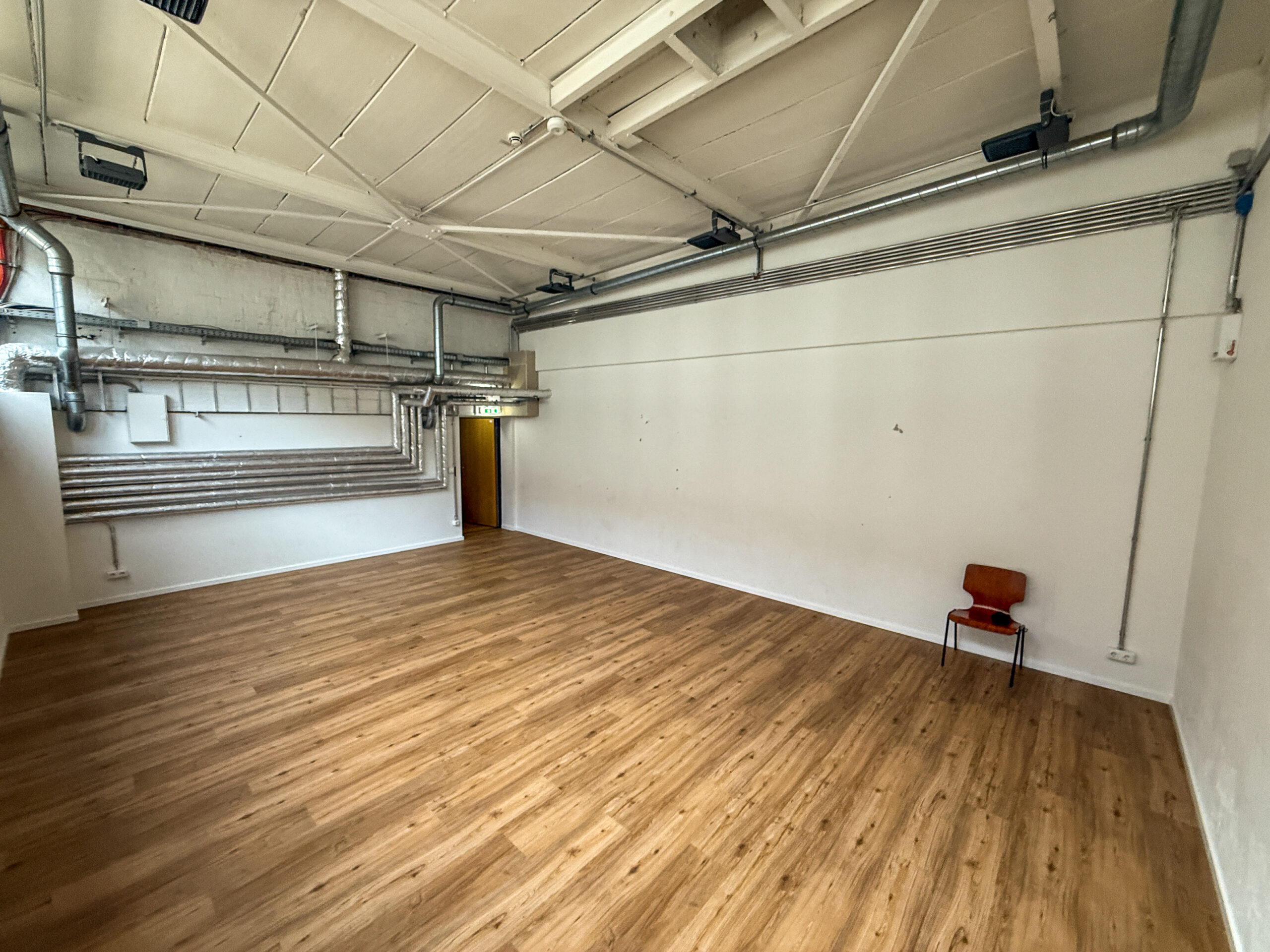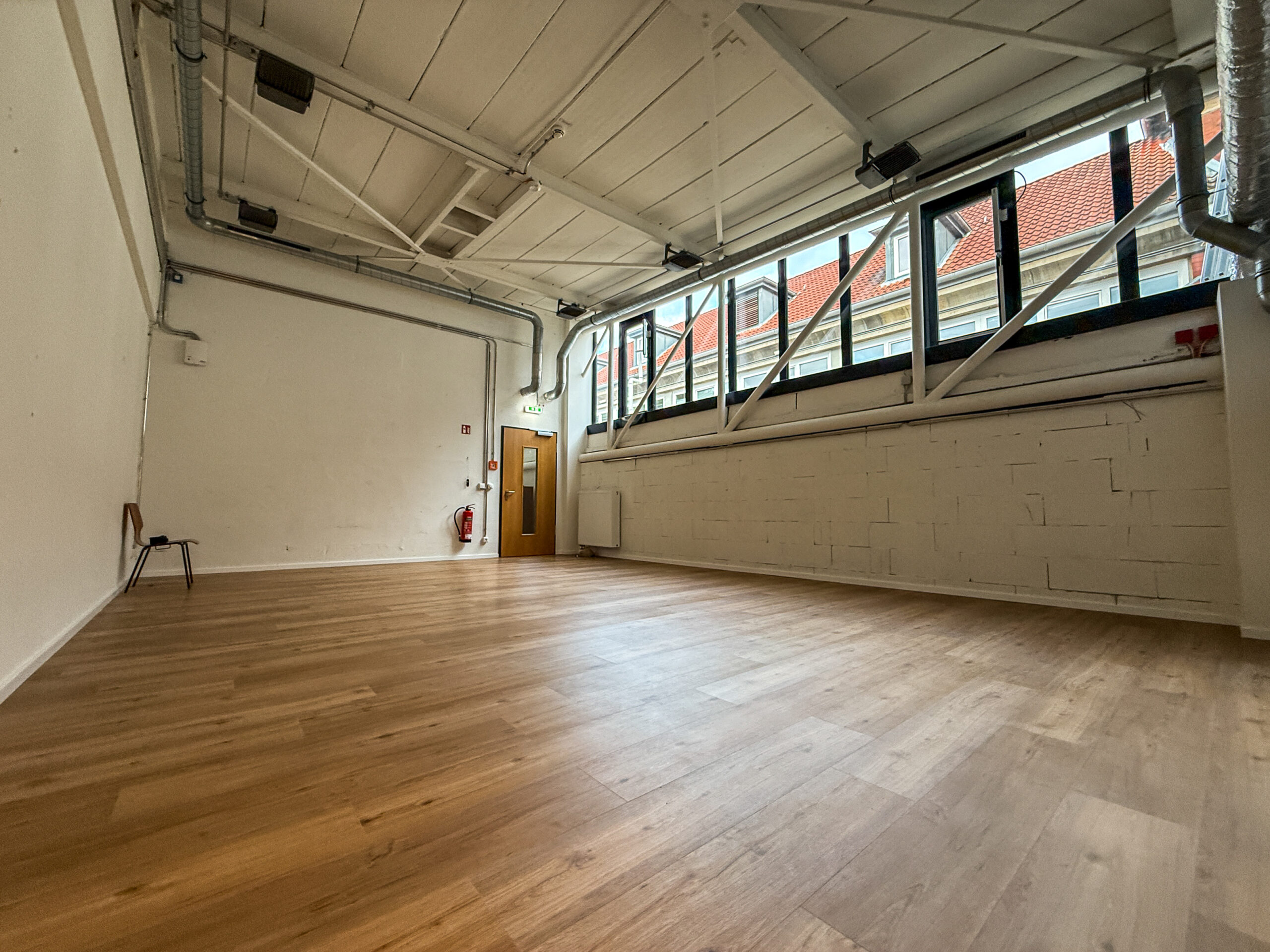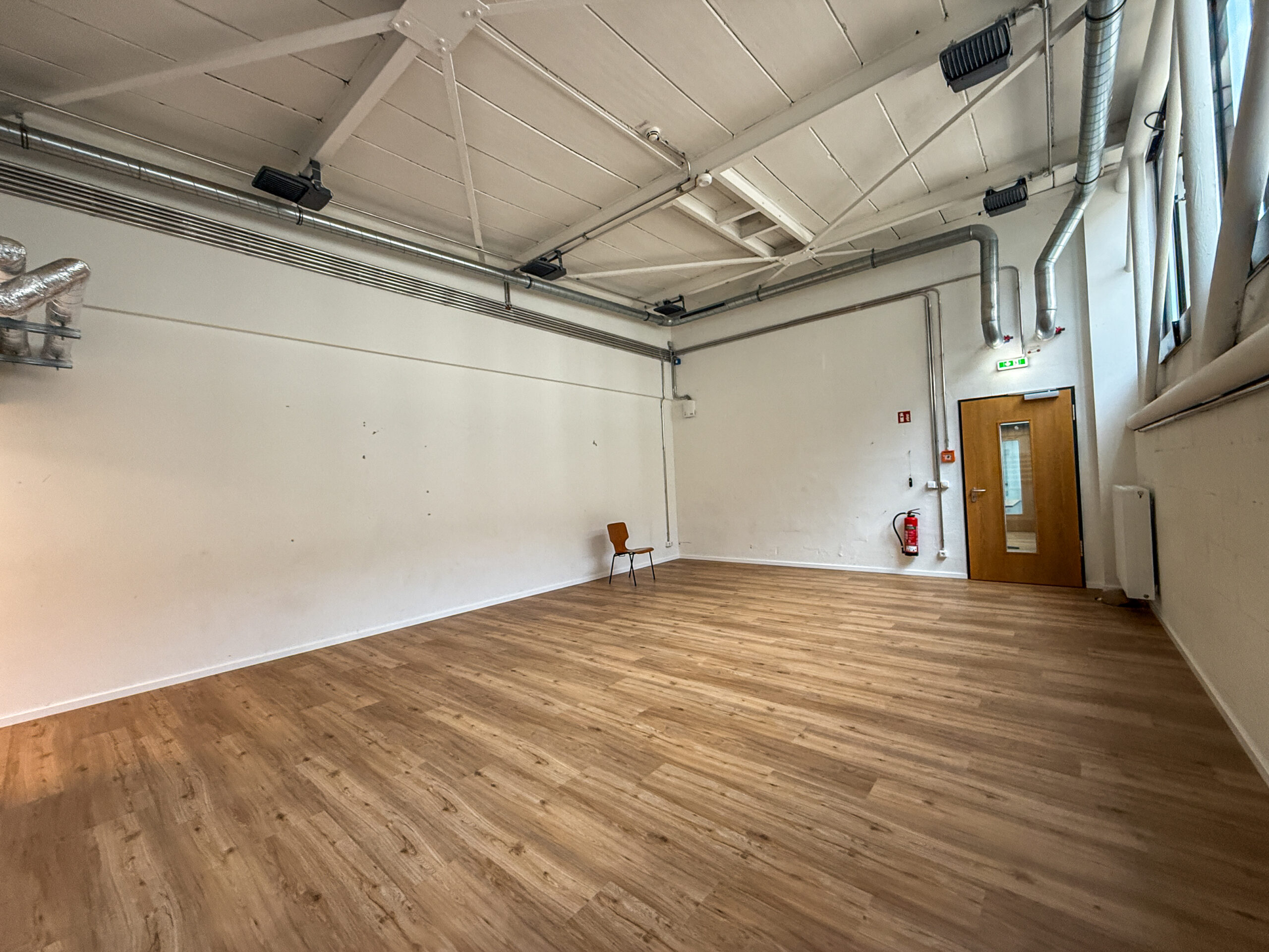 Der Probenraum im OG gehört mit einer Grundfläche von 45 qm zu den kleineren Räumen in der WIESE, punktet aber durch seine Höhe von 3,80 m und viel Tageslicht.